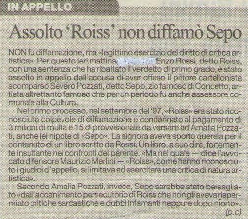 Il pittore Concetto Pozzati, falsificatore della propria scheda bio-biblio-iconografica e di quelle dei suoi avi (il padre Mario e lo zio Severo/Sepo), impegnato dalla nascita e full-time a millantare ruoli da protagonista in eventi che lo hanno avuto occasionalmente comprimario, oppure spettatore come in occasione della prima esposizione di Piero Manzoni a Bologna organizzata e recensita da Emilio Contini nel 1958 (cfr. “Dossier Piero Manzoni” pp. 49-55), continua ad affermare che l’autore del libro “Dossier Pozzati” edito nel 1990 è stato denunciato e condannato. Il ritaglio-stampa che segue (de “la Repubblica”) lo smentisce (sbugiarda?!) a futura memoria sua e di ogni suo supporter ròissofobo, sia coevo che postumo. Altro si può leggere cliccando nel sito www.rossiroiss.it il titolo del libro “incriminato”, mai repertorizzato dai bio-bibliografi pozzatofili.